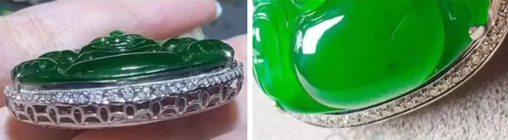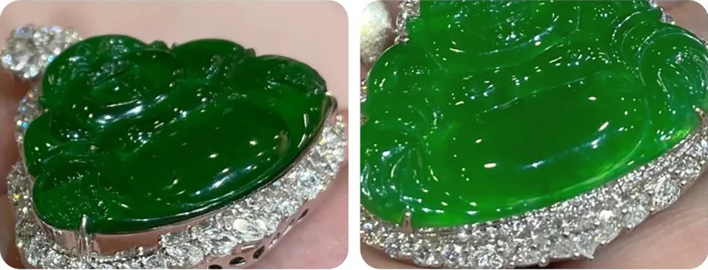 瓜料高色料在燈光下油亮,但是一旦背光就會變暗,所以瓜料翡翠從側面看顏色就會明顯變暗,而真正的帝王綠翡翠都是自己有光澤的,不需要藉助燈光自身光澤感就很強。