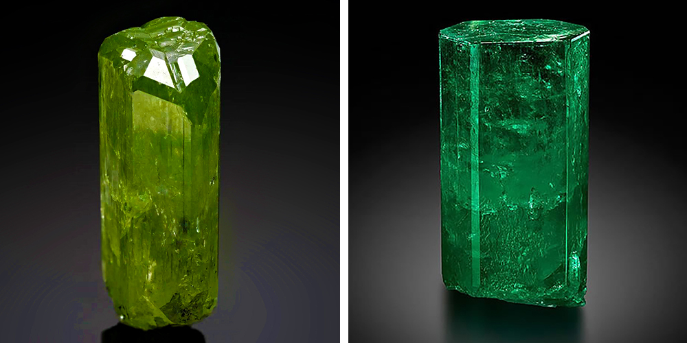 二者均為玻璃光澤、成色相仿,但鉻透輝石偏黃綠透亮且微微發暗,祖母綠則為偏藍的翠綠色且成色均一而濃艷。