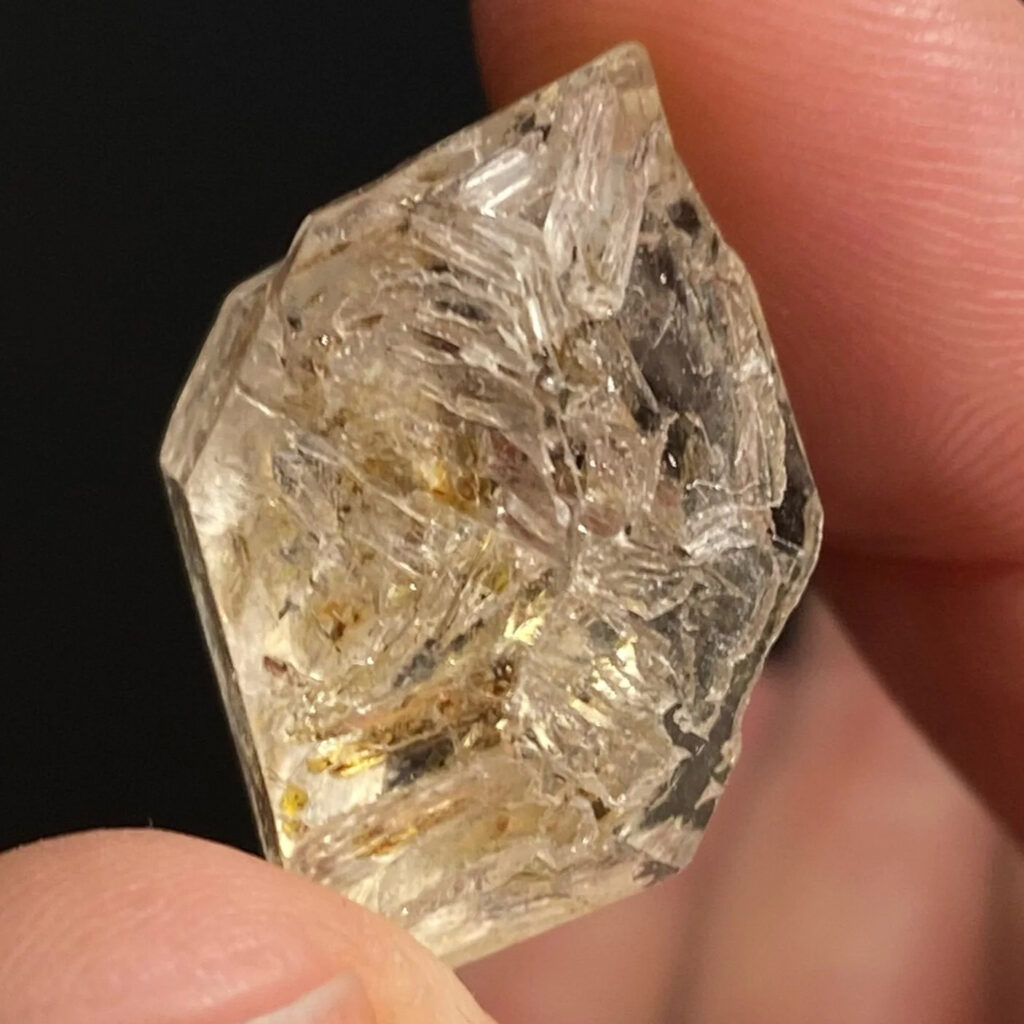 閃靈鑽是一種雙尖水晶,因晶體剔透如鑽石而得名;若內部含有黃色液體或氣泡包裹體,則稱為「油膽水晶」。在紫外光下,油膽會呈現螢光綠或藍色,散發迷人的光彩。